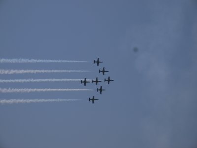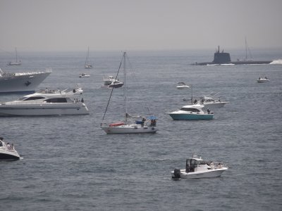 いよいよ航空ショーの海域へ到着。 目印となる大型船のふじ丸を中心に、まわり中、船だらけ。 なぜか原潜(たぶん)も航行中。 |
