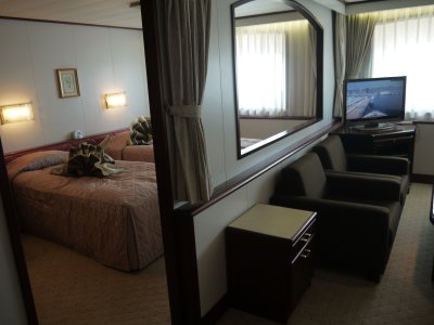 スイートルーム 大部分の人は寝台列車みたいなベッドのあるステートルームに泊まるが、 一部の人が泊まれるのが、ちゃんとしたベッドなどのある、 スーペリアルーム、デラックスルーム、そしてスイートルームだ。 今回はサービスで一部屋ずつ開放してくれたので、 乗船後の空き時間に、まずは、モデルルーム見学へ。 ふつーのホテルでもスイートなんか泊まったことないが、 しばし、ゴージャスな感覚に浸る。 |