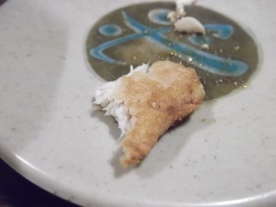 食べかけになってしまったが、たしか、これはサメだったはず。 ぼくもはじめて食したが、鶏カラのような味と歯ごたえで、 予想外に美味しかった。 |