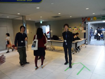立体投影に夢中になっている科学館スタッフ(笑)。 そうそう、ゲームコントローラーで操作できるのも楽しかった。 |