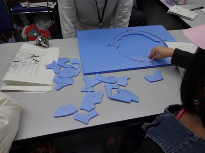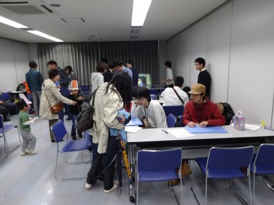 さすがに子ども相手は手慣れていて、 5つのテーブルに各一人ずつスタッフが付いて、 イプシロンロケットの製作を上手に指導していた。 |