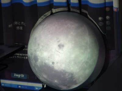 こちらもはじめての出し物。 月や惑星の表面を正射図法だったか何かで動かすソフトがあるらしく (京大で開発したものらしい)、 球体表面に投影すると、立体的に見えるスグレモノ。 数日前のアベック台風の動画も凄かった。 |