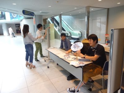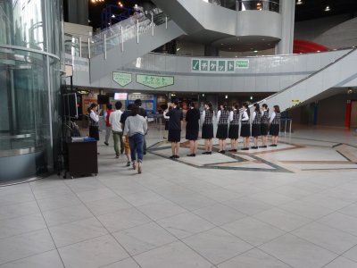 招集時間の9時には学生も集まってきて、 ポスターボードや受付の設営に取りかかる。 ちょうど科学館のおねえさんたちが朝礼点呼している中を、 渡部さんの後にしたがってポスターボードを取りに行くところ。 この後、おねえさんたちは発声練習とかしていた。 |