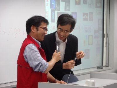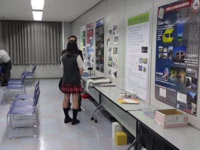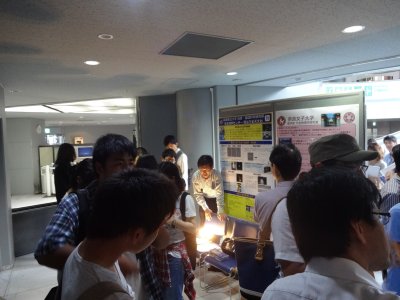 9時半ぐらいには、ポスターボードや受付など設営が終わる。 学生も5人ほど来てくれて、割と手際よく準備も終わった。 今年ははじめて大学から予算が少し付いたので、 学生にも謝金を出すことができた。 そろそろ科学館が開館する時分だろう。 |