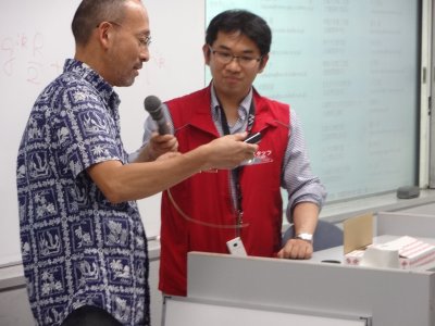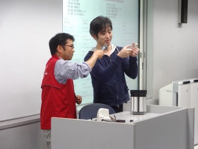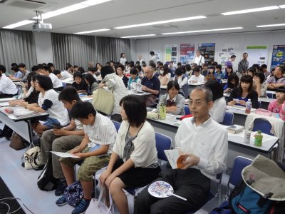 今年は出だしが好調である。 去年の出だしは微妙だったが、 今年は科学館の開く9時半ぐらいには最初の来訪者もいて、 受付開始となる10時時点で、すでに20名もの高校生が記帳している。 来た人にはどんどん説明を聞いてもらっていて、これは、 京大の長田さんに熱心に尋ねている女子高生。 結局、今年は、高校生や学生の参加者は80名、 教員や父兄その他、一般の参加者も43人で、 合計は123人と、研修室が超満員の大盛況となった。