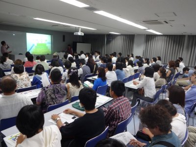 最後は天文講演会で、司会は渡部さん。 この段階では、数割の人は帰るので、 会場は少しゆとりができている。 |
