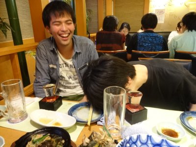 会場片づけが終了しても4時半、まだ店が開いてないよう。 昨年同様、店の前で少し待って、学生5人と5時から飲み始める。 これ、酔いつぶれているんじゃなくて、 こぼしたお酒を飲んでいるとこ。 |