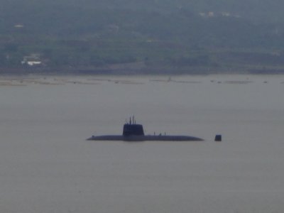 あいにくの曇天で桜島の全景は見られなかったが、 湾内にはあやしいシルエットが;; 潜水艦はさすがにめったに目にすることがない。 |