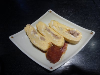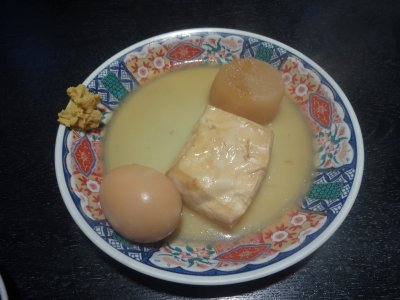 見た目はふつうのおでんだが、味噌の味が玉子の中までしっかりしみて、 たぶん自家製のからしが甘い。 |