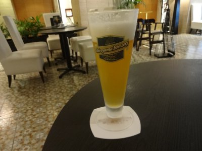 城山観光ホテル、もう一つのウリは、 ホテル自家製のベルギービール。 露天風呂から戻って、もうおなかはいっぱいだったので、 一杯だけ小ミカンのエールを飲んだ。美味しかったぁ。 |