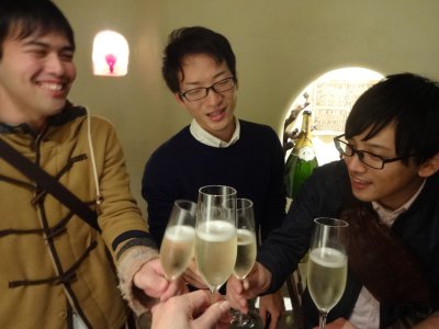 バイトで遅れてくる院生や、仕事が終わってから来るOBが、2次会で合流。 久しぶりにBouchonに行ったら満員だったけど、すぐ空くだろうとのことで、 折角なので店の前で空くのを待つことにした。 結局、小一時間ぐらい待たされたんで、その間に、 店員さんがサービスで出してくれたスパークリングで乾杯! |