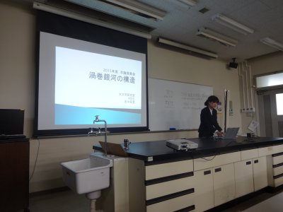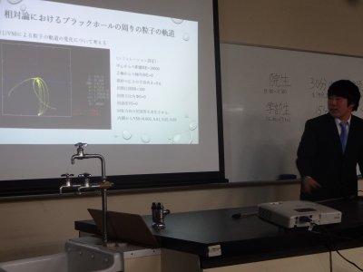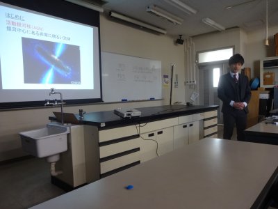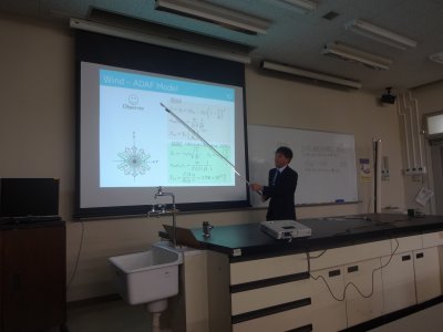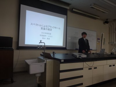 早川くん 低光度活動銀河核におけるシンクロトロン放射スペクトルの特徴 と、ここまで院生。 今年の院生は内容が濃くて充実していたけど、 専門的な話が4人もあって、聞く方は、さぞ大変だっただろう。 |