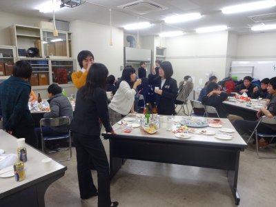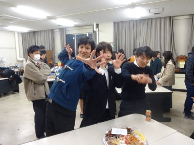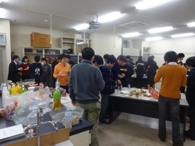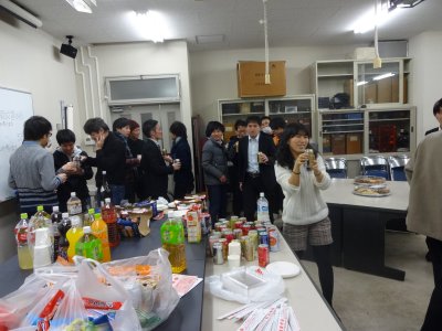 まだまだ元気 1時間半ぐらい経過した7時半ごろ。 元気な人間はまだ立食でしゃべくっている。 |