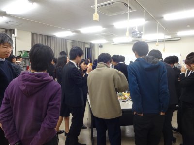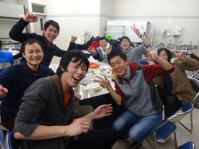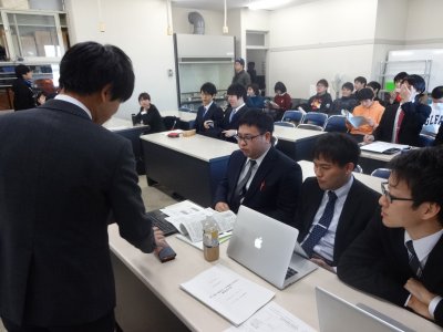 黒ずくめ4人組 まずは、午前が修論審査会だが、この黒ずくめの4人である。 ちなみに、後ろの方の席がかなり埋まっているが、今回は 2回生や1回生も何人も参加してくれた。 |