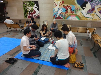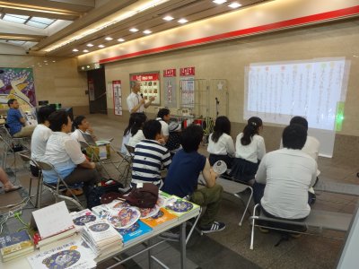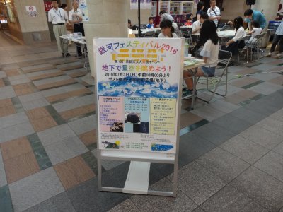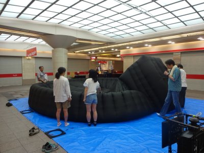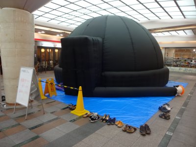 | 元ちゃんこと坂元くんと作花さんが仕掛け人の、 モバイルプラネタリウム@京都ゼストの第一回が実施された。 主催者グループ(京都天文大楽院)とか、 イベント名(銀河フェスティバル)とか、 いろいろ決め、同時開催のイベントもいろいろ決めていき、 “地下で星空を眺めよう”などのキャッチコピーを入れたポスターを作ったり、 どたばた作業のうちに、開催日になった。 予想外の盛況で、モバプラ9回の入場者は100人を超えたようだ。 | |