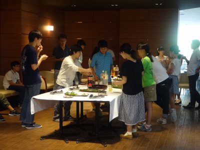 昼は、テッラの方でバイキング。 いろいろ話もあちこちで盛り上がっていた。 |