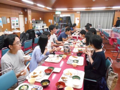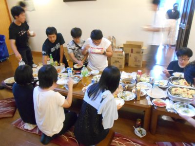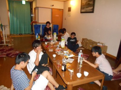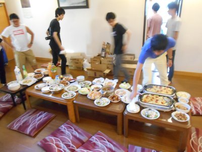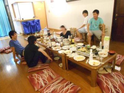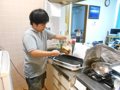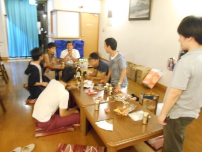 2日目朝は、ぼくもあまり疲れておらず、 いつもどおり5時前には目が覚めたので、 3時間ぐらい、ゲームしたり寝転がったり、 ゴロゴロとしていた。 8時9時になると学生も起き出して、 朝から、小路口クンの大ハンバーグも振る舞われた。 |