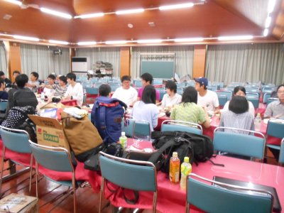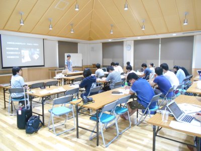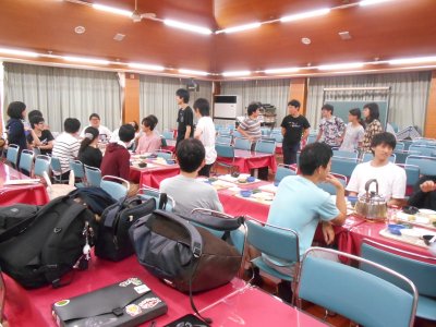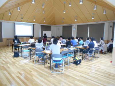 初日夜遅くに実習打ち合わせなどで遅れた3人ほどが到着し、 総勢24人になったが、創作活動室が広々としているので、 ゆったりゼミができた。 |