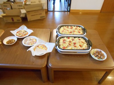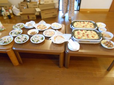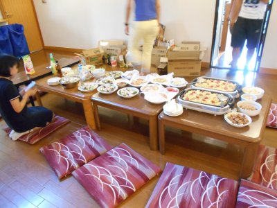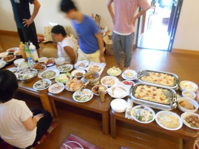 2日目:恒例の料理大会 いよいよ料理ができあがってきた。 料理が出来上がり、だんだん並べていくと、もーテーブル一杯。 今年も段取りがよくて、6時前には全料理完成。 |