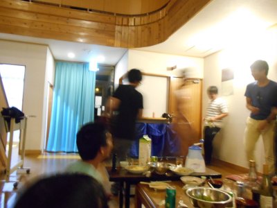 家族用ロッジへ戻って、一休みした後に、少しずつ飲み始める。 9時ぐらいには学生も集まってきて、だんだん賑やかに。 |