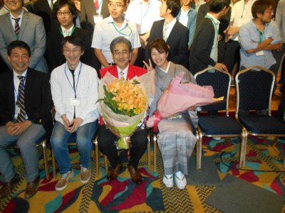 初日のトップに、大須賀くんがオープニングスピーチ。 梅村くんの業績も含め、さすがに上手にまとめていた。 |