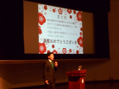 2日目のラストは梅村くんの記念講演。 自分の研究の歴史その他、やはり上手にまとめていた。 唯一、最後の、この言葉の意味を知らないのだが。。。 |