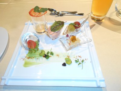 みなさん量は要らないし、もっとも安いカジュアルランチコースにしたが、 さすがに結婚式場のフレンチ系か、 こんな綺麗で美味しいオードブルからスタートした。 |