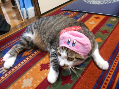 星の子カービィの頭巾…実は嫌がっている