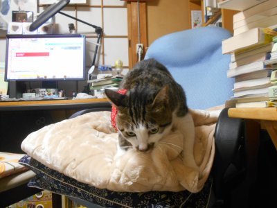 肘掛け椅子の上が大好き場所だったのが、 6月の地震以来、揺れる椅子の上に乗れなくなっていた。 3ヶ月経って、ようやく好きな場所に戻れた (したがって仕事椅子がまた取られた;;)