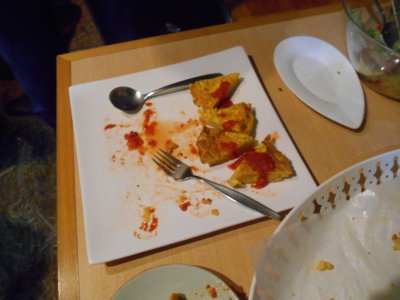 スパニッシュオムレツ 料理はオードブルからはじまり、ずいぶんとたくさん出てきて、 これは中ほどのスパニッシュオムレツ。美味だった。 |