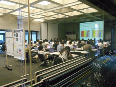 講義中 会場に着いたときは、まだ大会議室で講義中。 なかなかの賑わい。 |