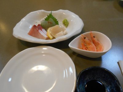 刺身盛り まずはオードブルで刺身盛り、 それも、一人前ずつである。 半分ぐらい、同じ席の院生に回した。 |