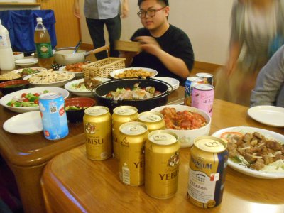 |  | 大ご馳走:おさけも 最近は黙っててもプレモル買ってきてくれるが、 今年は、ロゼのスパークリングとか、 純米の天狗舞など、お酒もとても充実。 いつ寝てしまったか、ぜんぜん覚えていないくらい、 楽しく美味しく呑めた一夜でした。 最終日もゼミを行って、全員、無事、帰宅…までが大事。 |