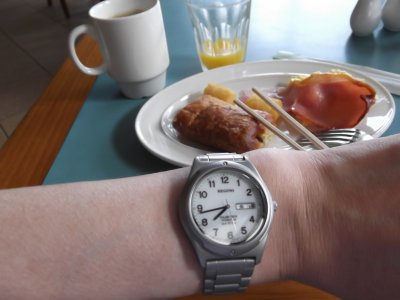 ![]() 最終日の朝食。 さすがにちょっと二日酔いが残ってたし、食欲もなかったが、 機内食は期待できないので、少しだけ食べておいた。 時間は+1時間。